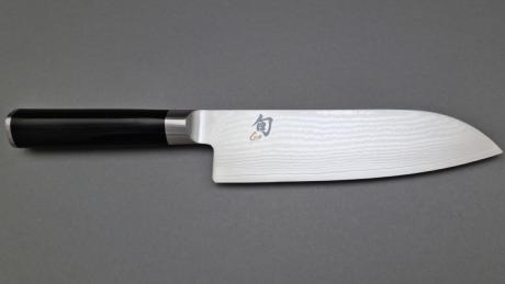 Ce couteau de cuisine japonais santoku Kai Shun Classic ainsi que cette planche à découper sont livrés en coffret.