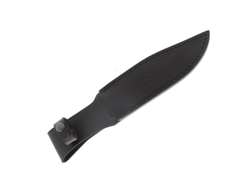 Couteau lame fixe Muela Mirage, lame dentée en acier inox 420 de 18 cm et manche en gomme noire. Livré avec un étui cuir.