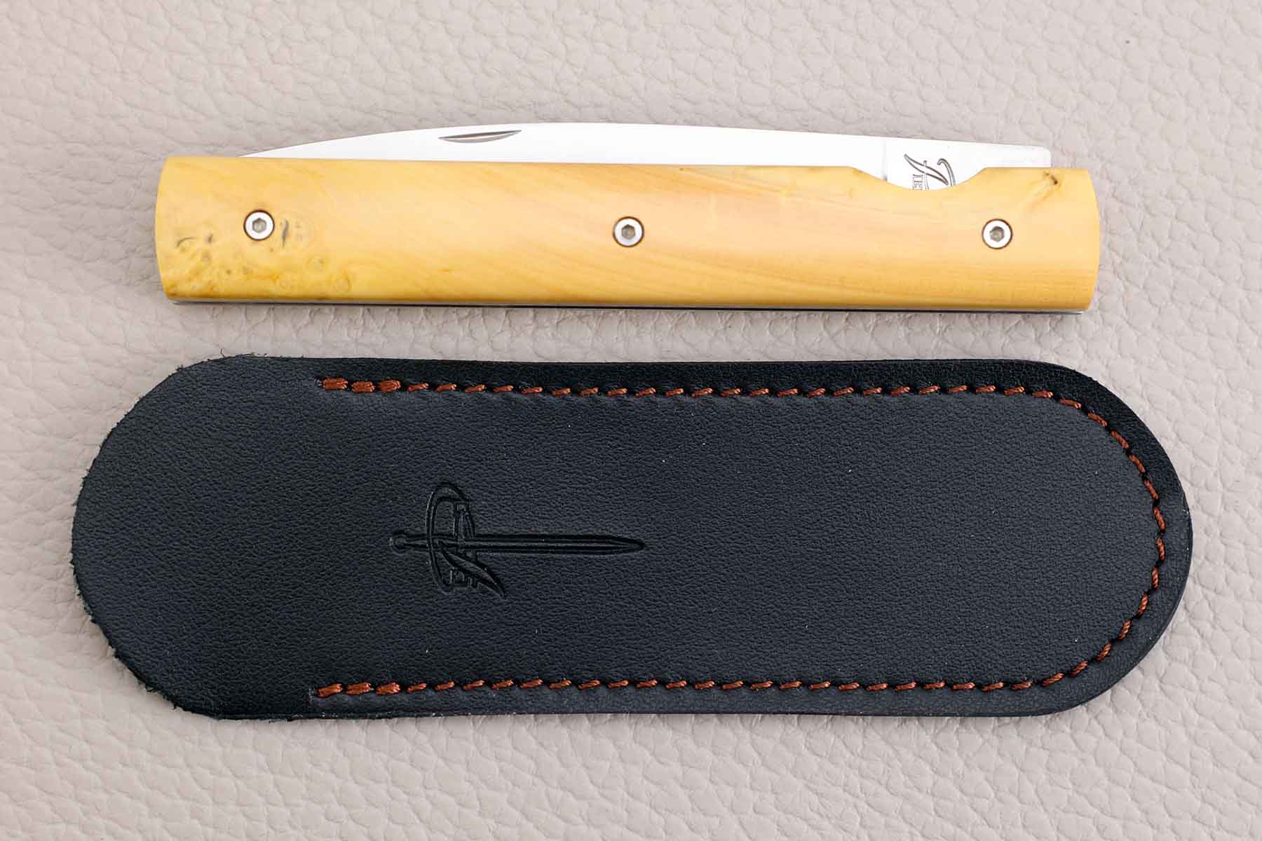 Chaque couteau Le Français est livré avec un étui cuir de vachette pleine fleur.